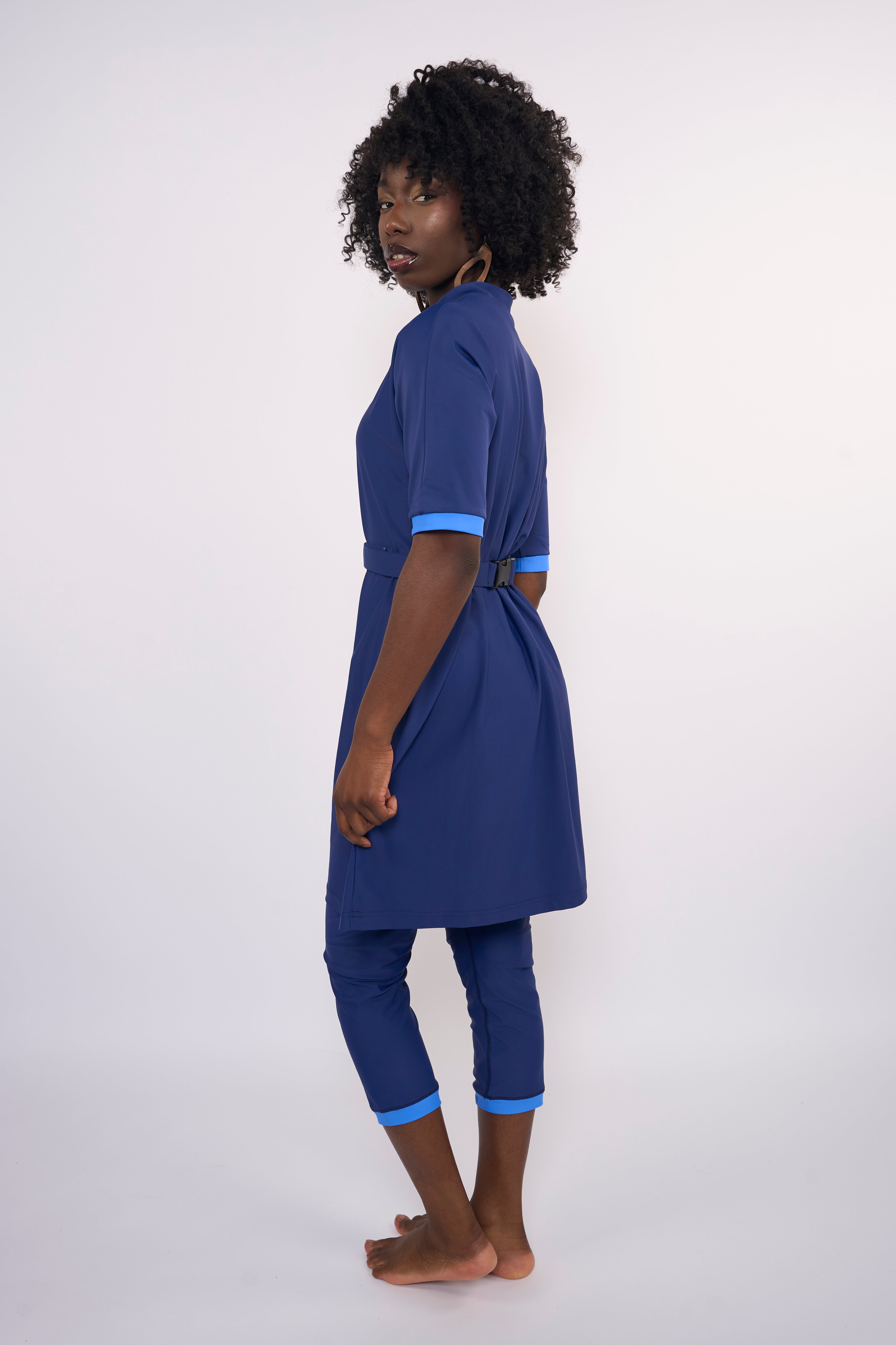 The Blue Motion Set is perfect for women seeking modest swimwear with a sporty, modern look. The tunic has a half-zip design and a matching belt for a comfortable, flattering fit. Light contrast details at the sleeves and leggings give the set a fresh and stylish finish.
