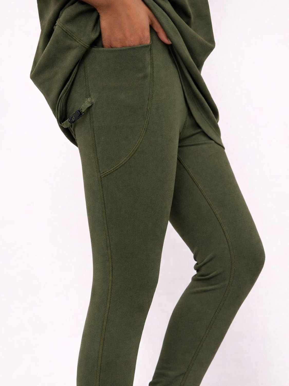 The leggings include a discreet zipper pocket, perfect for safely storing small items during activity. Both pieces feature soft branded detailing, adding a subtle and stylish touch.