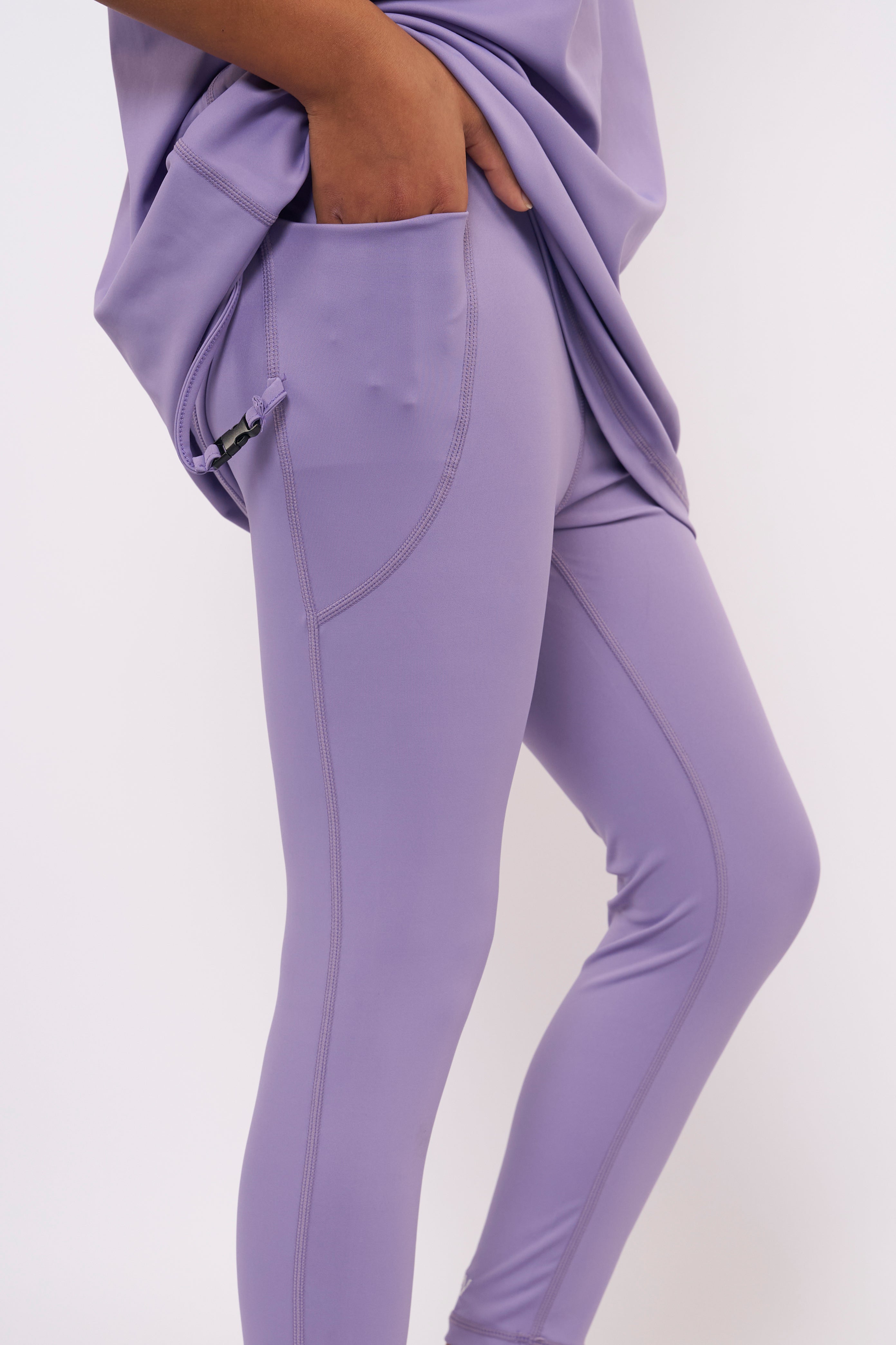 The leggings include a discreet zipper pocket, perfect for safely storing small items during activity. Both pieces feature soft branded detailing, adding a subtle and stylish touch.
