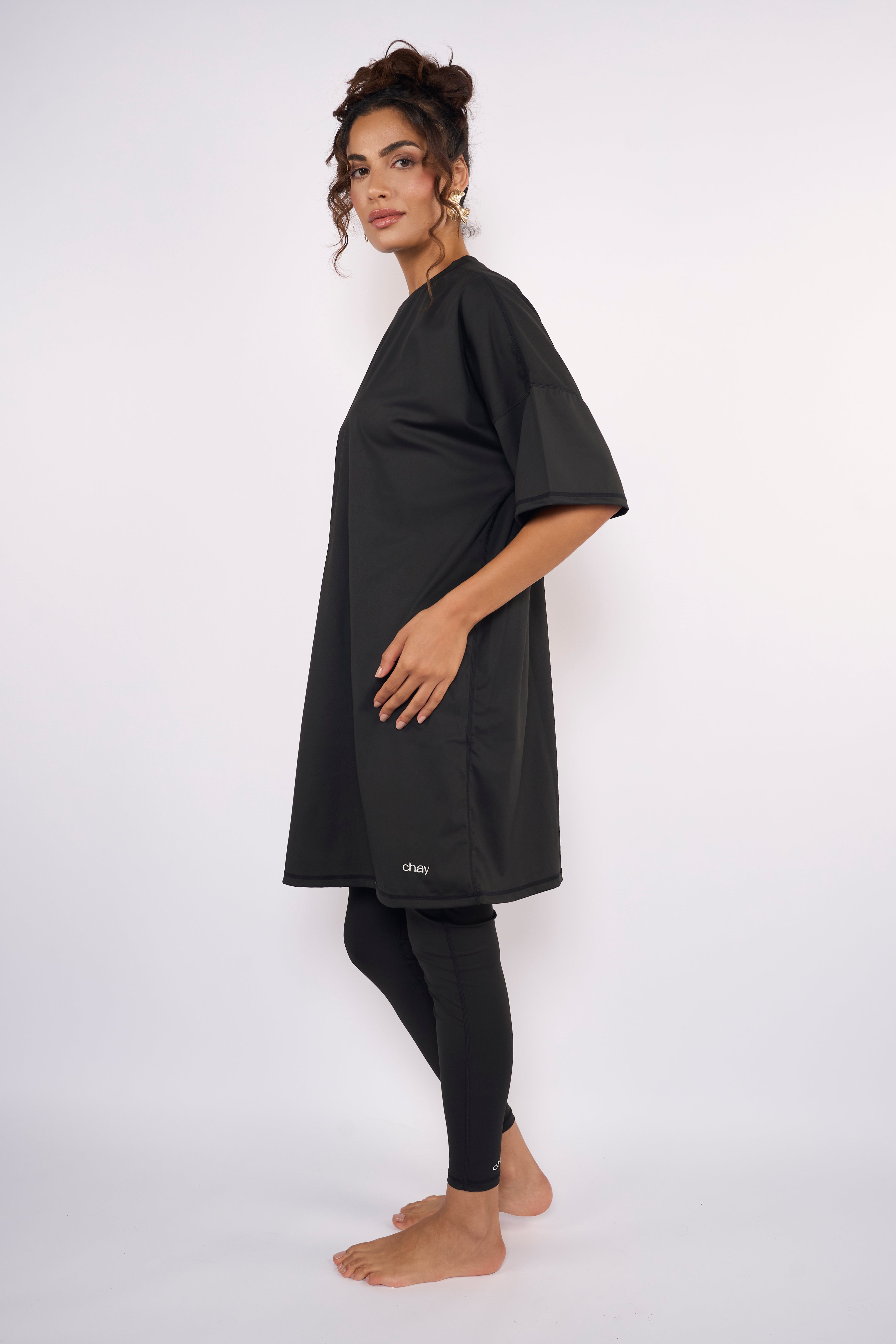 The SeaActive T-Shirt Set is a perfect choice for women who want modest, comfortable, and easy coverage while swimming. The oversized T-shirt has a relaxed fit that allows full movement, while the matching leggings create a sleek and sporty look. A discreet zipper pocket on the leggings keeps small essentials secure.